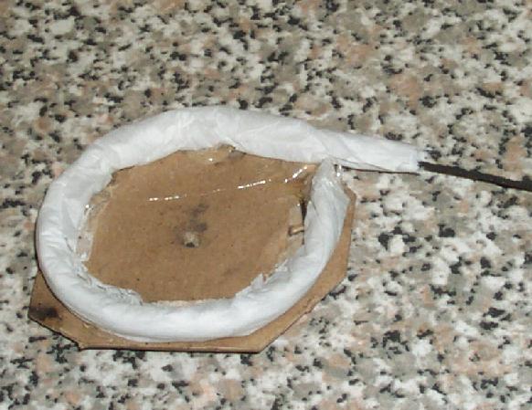 The outer wrap was done with just moistened kitchen wrap, about 60 mm wide. The tube was then coiled and hot-melt glued onto the cardboard recovered from the previous test.
