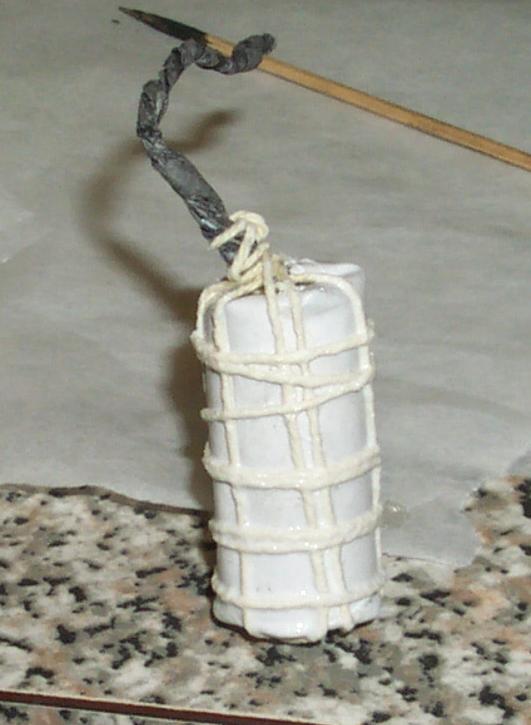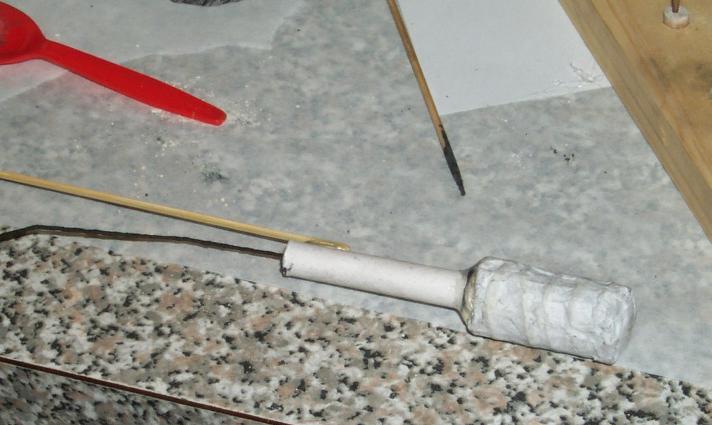 The fuse on the canister shell was folded over and cut to a 10 mm length (about 1 second). The ends were dipped into meal-NC paste and then plunged into the pulverone in the top of the motor casing. A bead of hot-melt glue was used to attach the canister firmly to the rocket motor.
