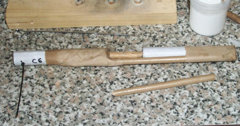 A passfire hole was drilled at end of the first driver, and quickmatch connected it to the second driver; A piece of thin blackmatch was glued into each hole with some meal-NC paste, the quickmatch placed and the kraft nosing used to secure it in place.