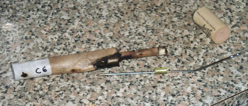 The first driver was charged with Chrysanthemum #6, the second with my Rocket Propellant. The nozzle holes were placed so as to create a reversing effect, with the dimmer C6 composition burning first, followed by the the might brighter Aluminium effects of the RP composition.